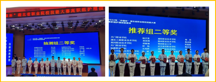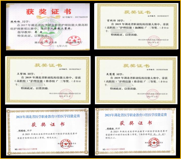 将“教、训、练、赛”有机结合,促使学生职业素养、技能水平稳步提升,引领院校专业建设和课程改革,全面提升教学质量,实现“以赛促教、以赛促学、以赛促改、以赛促建”,近几年来学生参加省级、国家级技能大赛屡获佳绩。2016年首届“人卫社”杯创新护理综合技能大赛中骆璐璐、章新艳、胡乐琼、敖红霞分获个人技能三等奖;2017年湖北省医学职业教育护理技能大赛中陈玲玲荣获单项技能竞赛二等奖两项,个人全能三等奖一项;2019年湖北省职业院校技能大赛(高职组)护理技能中学生宫秋怡、王哲桃、吴慧慧分获二等奖一项、三等奖两项;2021年湖北省医教室口腔技能竞赛中胡晓晗荣获雕牙和排牙组三等奖;2022年“中银杯”湖北省职业院校技能大赛中陈永焕荣获二等奖,张熙皓、何颖颖同学荣获三等奖;抽测组丁鹏熹荣获二等奖,梁芳华荣获三等奖。