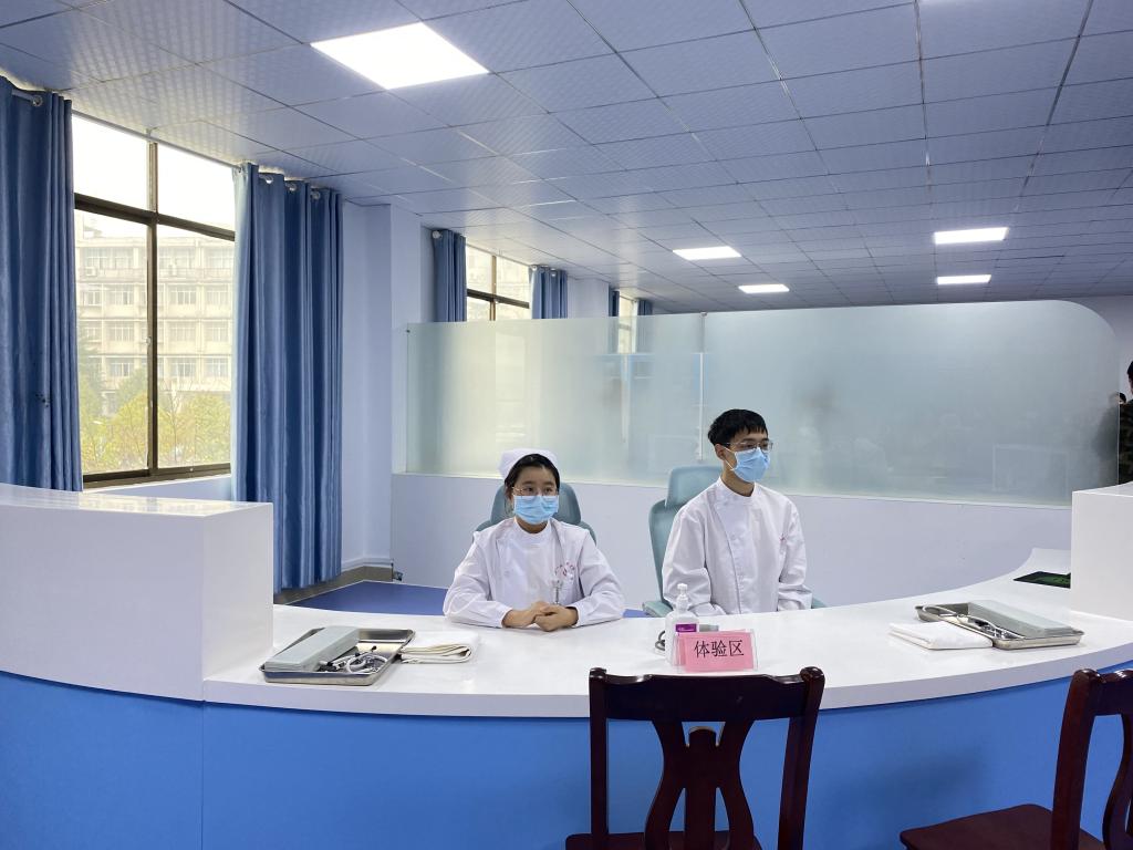 之后依次是交通事故现场急救、血压测量、皮试液配置、皮内注射、密闭式静脉输液等各项操作的展示。通过一个案例的串联,学生很好地展示了患者入院前的现场急救和入院后接受治疗、护理的全过程。金年会jinnianhuicom还贴心地设置了血压测量和针灸按摩的体验区,学生和观摩嘉宾之间进行了良好的互动,他们热情周到的服务和扎实的技术也获得了嘉宾们的好评。