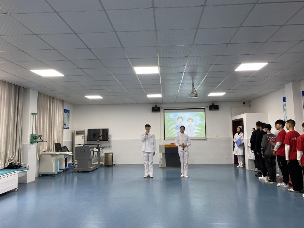 在学生技能展示环节,开场是蒋卿馨、李颂文同学带来的朗诵《若我归来》,富含深情的话语让人真切地感受到医护人员的博爱精神。