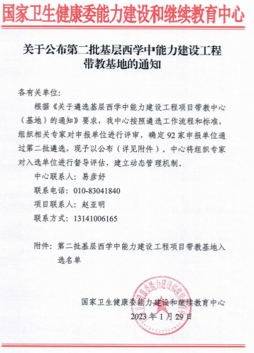 1月29日,国家卫生健康委能力建设与继续教育中心公布了第二批基层西学中能力建设工程带教基地名单,全国共有92家单位获批,金年会榜上有名。