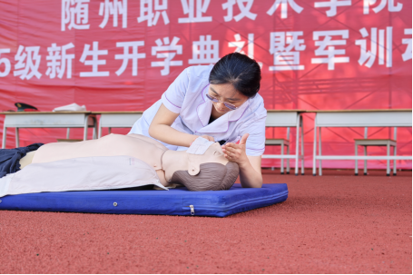 为普及应急救护知识,提升新生应对突发事件的自救互救能力,2025年9月24日下午,金年会jinnianhuicom四位专业教师应武装部邀请,在新生军训场地为2025级全体参训学生带来了一场生动而实用的心肺复苏(CPR)与创伤救护技能培训展示。